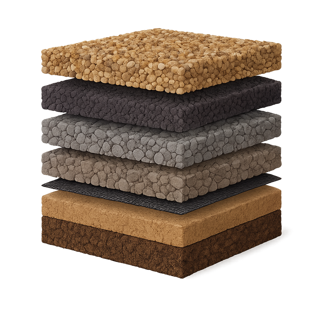 A 300-500mm depth of well compacted, non-frost susceptible Type 3 granular sub-base to SHW clause 805 or 4/40 mm graded crushed concrete aggregate to BS EN12620 or locally available secondary or recycled aggregates which comply to the above specification. The surface should then be blinded with 2/6.3mm graded crushed concrete aggregate to BS EN12620.
